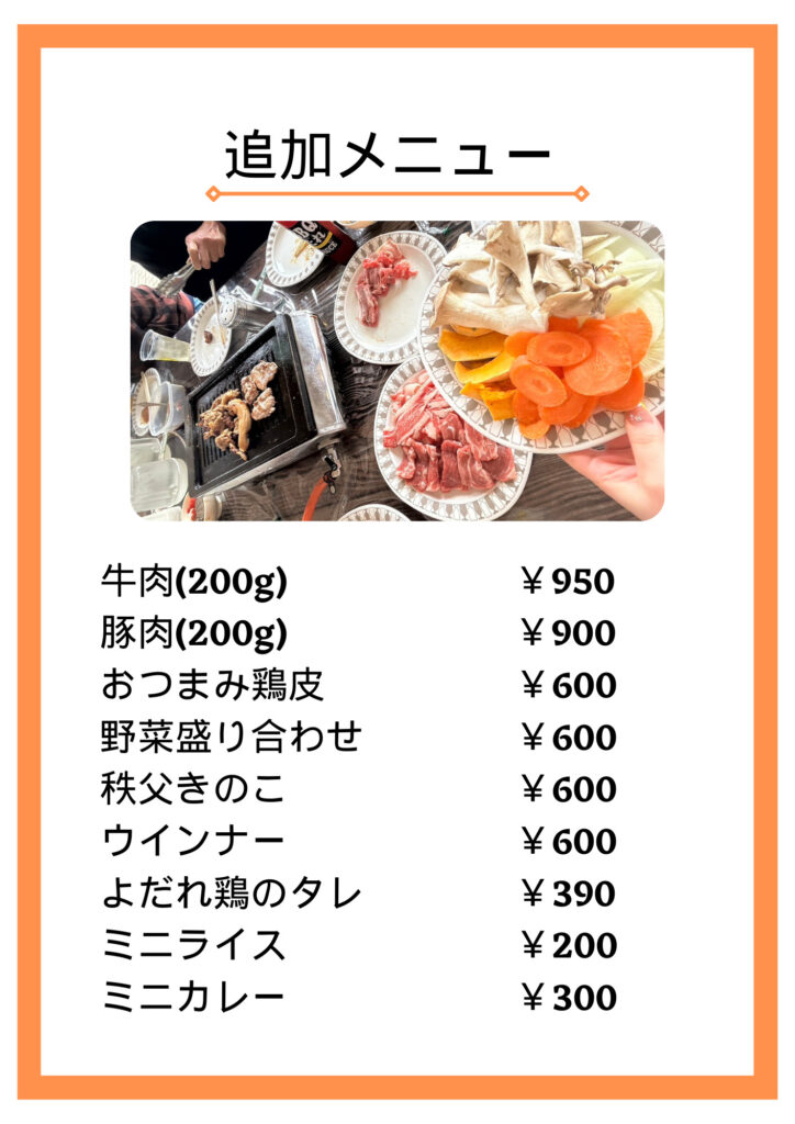●牛肉50g、豚肉50g、秩父野菜・秩父きのこ盛り合わせ、ウインナー付き‼︎